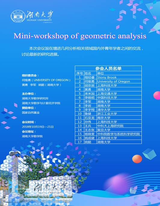 召开“Mini-workshop of geometric analysis”。会议拟邀请国内外高校院所几何分析相关问题的青年学者参会。本次会议由湖南大学数学与计量经济学院举办,受国家自然基金项目和偷拍自拍