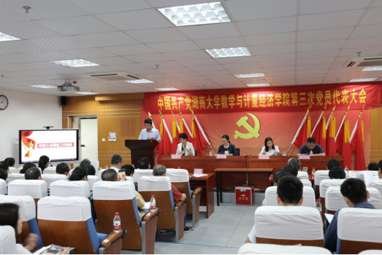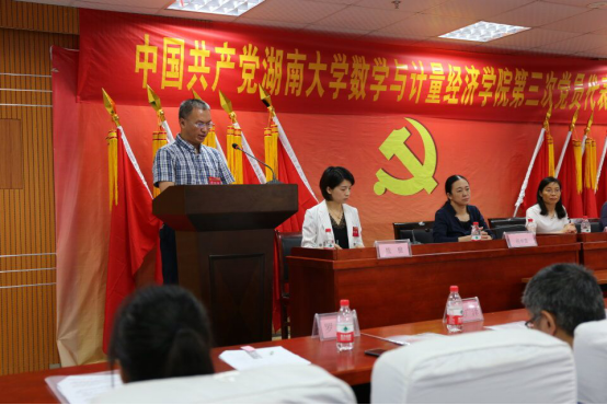 数学与计量经济学院第二届委员会作题为《不忘育人初心,牢记时代使命,团结协作,攻坚克难,努力建设国内一流数学学科》的工作报告。在报告中,程卓蕾同志对过去七年工作进行了回顾和总结,提出了未来四年发展思路和工作目标,呼吁全体党员干部和师生员工继续牢记使命,凝聚新时代数学人的精、气、神、团结协作,为创建国内一流的数学学科不断努力奋斗,为学校争创“双一流”做出新的贡献。大会还以书面形式审议通过了《党费收缴、管理和使用情况的报告》、《大会选举办法》。在主持人宣读了两个委员会候选人名单之后,61位党代表正式进行投票选举。