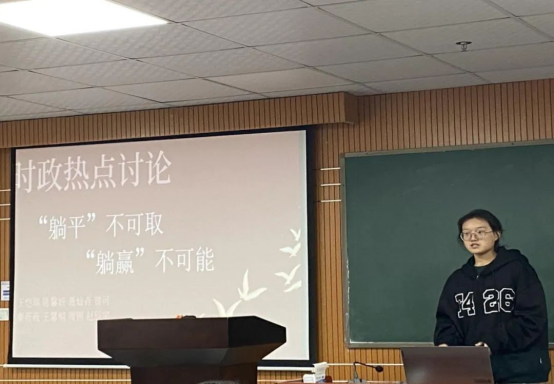 第五组由黄予同志进行分享,该小组讨论主题是疫情防控。他们讨论了疫情,我们“躺平”了吗?以各部门措施引入,讨论二十条内容,分析了二十条的优势,最后队讨论的问题作出回答,我们没有躺平。