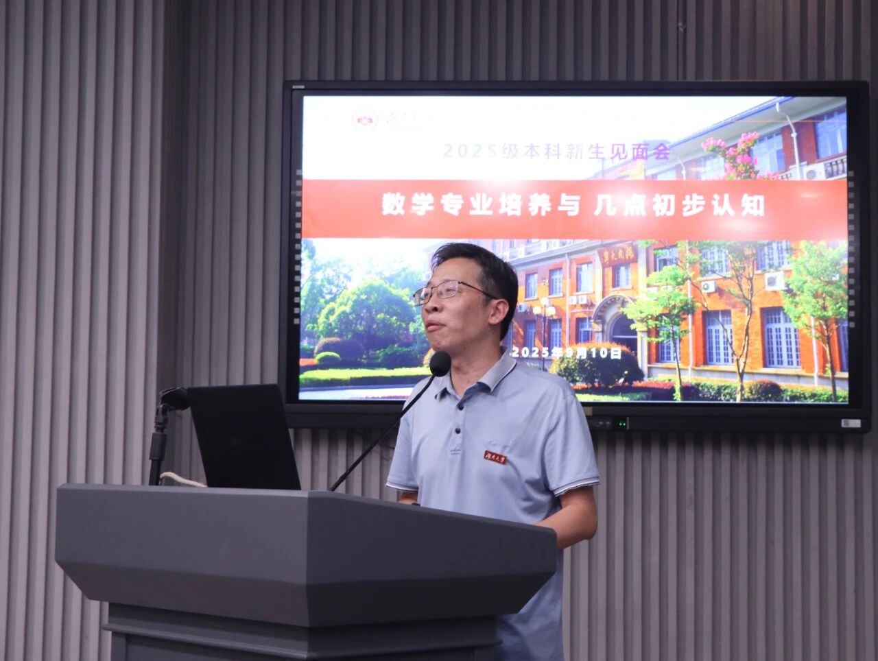 黄勇老师向开启新征程的同学们表示热烈祝贺和欢迎之后,先后回望发展历程,聚焦学科优势,解读数学价值,寄语成长方向。在介绍学院核心竞争力时,黄勇老师从 “科研成果、师资力量、人才培养” 三个维度展开,介绍了偷拍自拍 师资、科研、育人 “三驾马车” 齐驱的深厚学术底蕴。随后,黄勇老师也真诚地向新生分享学习数学的经验:学习过程中要保持信心、学习方式可以借鉴学习语言类科目的方法、学会的最好证明就是能讲给别人听。黄勇老师定义同学们是连接数学世界和现实世界的 “翻译者”。他指出,数学不是孤立存在的学科,需学会用数学眼光看待世界,并向各位新生寄语:“数学梦想” 引领方向、“数学创造” 铸就未来。